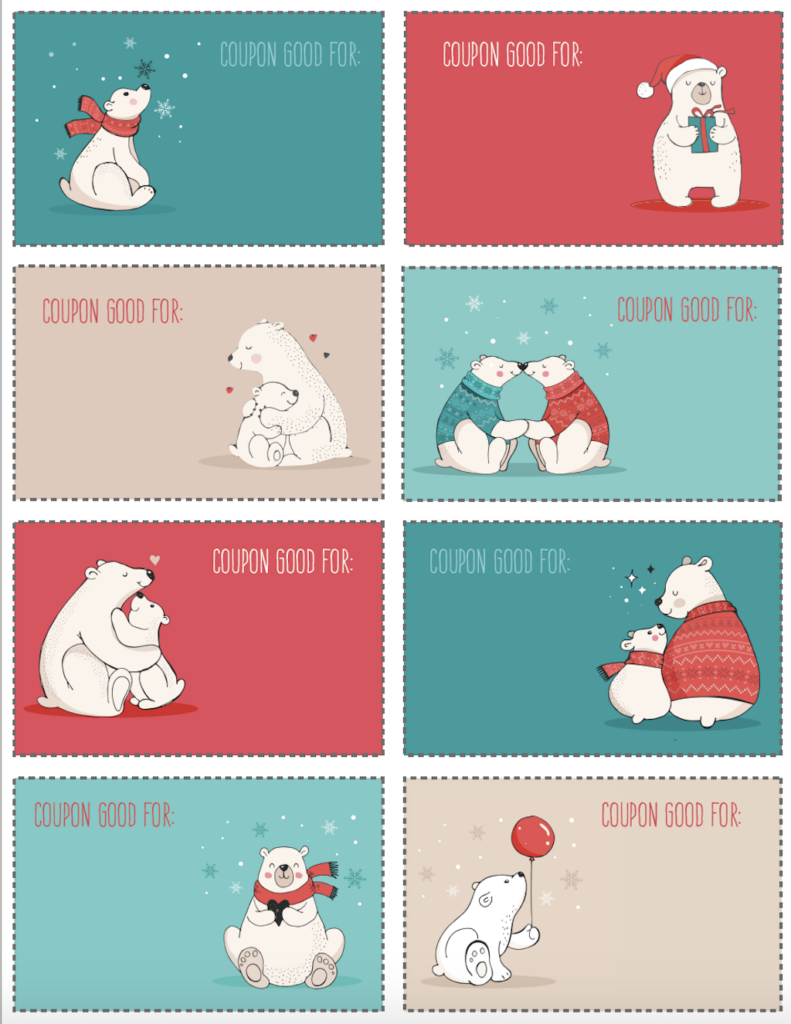 Printable Christmas Coupon Booklet for Kids or Adults First, choose the printable coupons that you want from the choices below and print them out. You can also print out several copies of the blank Christmas coupon template and fill in all of your items if you do not like any of the filled-in coupons. The effortless way to make a coupon book is to staple the coupons together into a booklet.